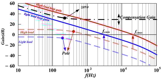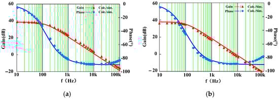 Figure 12a,b show the calculation (lines) and simulation results (points) of the circuit transfer function at different operation points. As discussed before, the transfer function is related to the load condition Re and the only state-space component Co, which determines the pole of Because the first-order system only has one pole, the PI controller with one zero is enough to correct the control system. There is a moderate design that places the zero of the PI controller near the pole of the circuit to compensate for the phase drop at the pole.