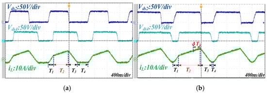 According to the digital CSC strategy, T2 is the only closed-loop control variable for regulating the output voltage. Shown in Figure 17, (a) is the light load (Io = 2 A) waveform of the inductor current, and (b) is the heavy load (Io = 4 A) of the inductor current. T1, T2, T3, and T4 have been marked on the graph. By comparing the two waveforms, it is apparent that the closed-loop regulation of the converter is only adjusted by T2, which is the direct output of the PI controller.
