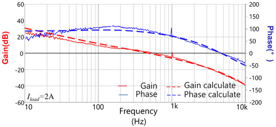 The calculation and measurement results of Ts(s)’s bode diagram when Io = 2 A.