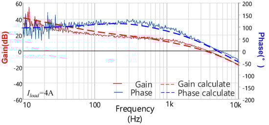 The calculation and measurement results of Ts(s)’s bode diagram when Io = 4 A.