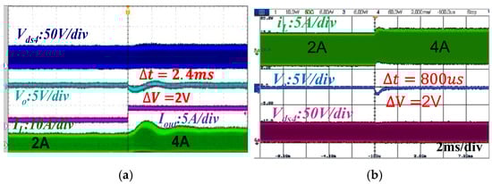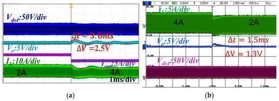 In Figure 20 and Figure 21, Vo is the output voltage, is the settling time of the load transient, and is the output voltage overshoot. When the small-signal model of the system is unknown, in engineering practice, the trial-and-error method and the empirical method are usually used to obtain a PI parameter [24]. The dynamic performance of the load transient using the PI parameters obtained by the trial-and-error method (kp = 61, ki = 1.38 × 106) is shown in Figure 20a and Figure 21a, where both usually exhibit larger overshoot and settling time. However, based on the reduced-order model and PI parameter designed in Section 2.3 (kp = 48, ki = 6 × 104), the FSBB converter shows smaller overshoot and shorter settling time in Figure 20b and Figure 21b compared to the traditional method.