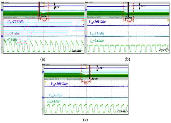 In order to verify the robustness of the designed algorithm to Vin, the input voltage transient tests are conducted on the prototype. The input voltage switches from 42 V to 54 V within 1 ms with a 48 V output. Due to the quasi-symmetry shown in Figure 5, the switching mode of the CSC strategy, the large-signal averaged switch model, and the small-signal model are nearly the same, as shown in Figure 12. Figure 22 shows the inductor current waveforms during the input voltage transition period, and the converter is kept stable.