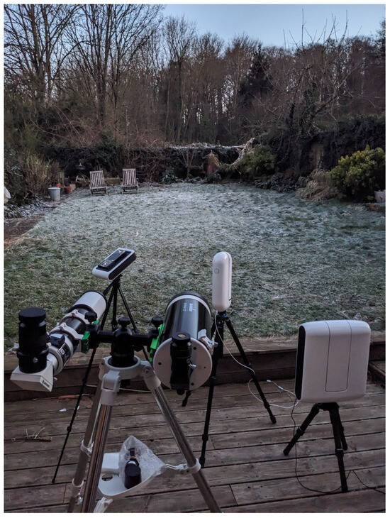 The observation sessions were carried out from Luxembourg, France, and Belgium, in dark places to avoid the light produced by public or private lighting (Figure 1). Given that the meteorological conditions have been quite appalling since 2024, data capture has been a real challenge: the slightest hour of clear sky in the evening or at night has been exploited to observe the starry sky. Part of the data acquisition process is presented in [,].