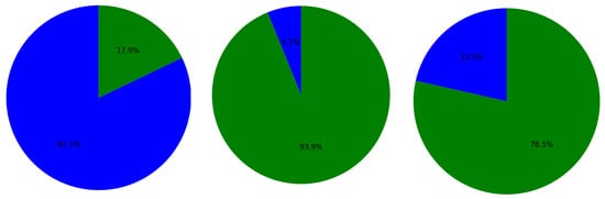 Considering 2692 patches of 256 × 256 pixels, percentage of images with point sources detected (blue represents the proportion of images with stars detected; green represents the proportion of images without stars detected); the original images are on the left, the images after applying the Starnet model are in the middle, and the images after running the nox package are on the right.