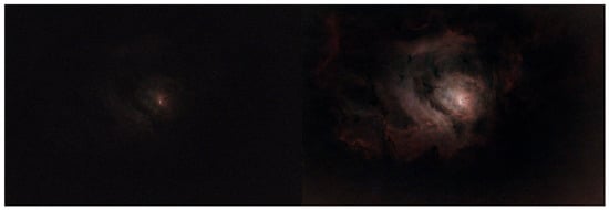 Observation of Lagoon Nebula (Messier 8) with a Vespera smart telescope (6 July 2023), and processing with Starnet. On the left, the stacked image after 10 s of capture; on the right, the stacked image after 1200 s of capture.