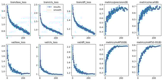 By using DeepSpaceYoloDataset, the annotated dataset described and published in [], we have compared a YOLOv7 tiny model introduced in [] to recent versions of YOLO architectures, in particular 8 and 11, with different sizes (nano, normal, and large). We used the YOLOv7 official Python package (0.1) https://github.com/WongKinYiu/yolov7 (accessed on 22 June 2025) and the Ultralytics Python package (8.3.95) https://pypi.org/project/ultralytics/ (accessed on 22 June 2025) without specific customization. YOLO-v7 implementation uses default hyperparameters such as , , , with augmentations like , , and . Moreover, we applied default data augmentation techniques during training, including Mosaic (combining 4 images), random affine transforms (scaling, rotation, and translation), HSV augmentation (colour changes), and horizontal flipping. YOLO-v8, from Ultralytics, follows similar defaults but with slight adjustments and improved augmentation handling. YOLO-v11 extends YOLO-v8 and includes automatic tuning over hyperparameter ranges to optimize training dynamically. For training, validation, and testing, we reshuffled the initial dataset to obtain 333 images for validation and 222 images for testing. The training was performed for 400 epochs, on 128GB RAM Intel(R) Xeon(R) Silver 4210@2.20GHz cores and NVIDIA Tesla V100-PCIE-32GB GPUs: Figure 4 illutrates the training of the YOLO8m model.