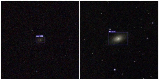 Execution of the YOLOv7 tiny model on two images of M64 captured with a Vespera smart telescope (27 April 2023): the first image was obtained after the stacking of 2 raw images, and the second one was obtained after the stacking of 115 raw images.