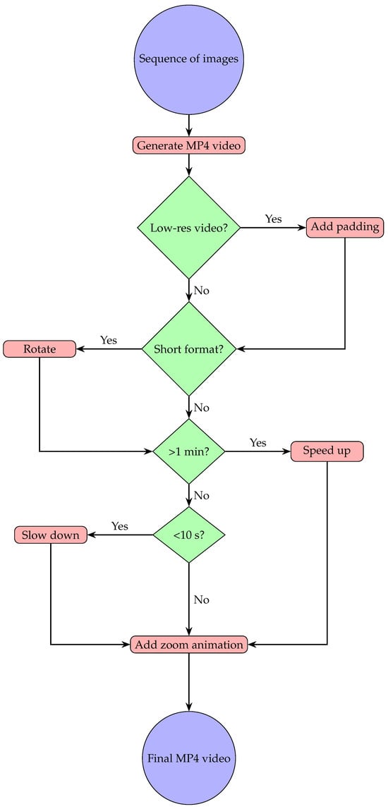 - Video generation with ffmpeg can take a few minutes: only the command creating a zoom effect is a bit slow as it generate frames to make a smooth effect.