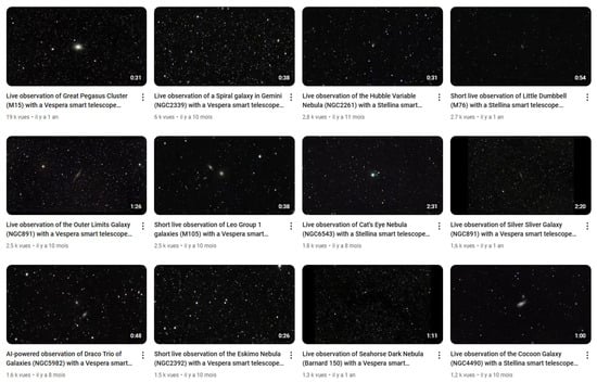 Astronomy is well-suited for online broadcasting due to its visually stunning nature (images of stars clusters, nebula, planets, galaxies, the Moon, the Sun, and even comets), the fascination it generates, and the ability to simplify complex concepts for a wide audience []. Animations, 3D simulations, tutorials, and real-time observations make the topics engaging and easy to understand. On this last point, astronomers and stargazers can use online platforms for sharing astronomical observations to offer streaming accessible to a wide audience worldwide. Potential interaction with viewers through live chat, and the ability to re-watch videos later, make the experience immersive, interactive, and educational. This is particularly valuable given that many people lack access to a suitable location for night sky observation, or may not have the time, motivation, or necessary equipment to engage in this activity themselves []. Astronomy clubs, outreach organizations and associations do their best to showcase night sky observations and make them accessible []. For instance, we can mention a yearly event called Nuit des Etoiles, organized by the AFA (https://www.afastronomie.fr/les-nuits-des-etoiles (accessed on 22 June 2025).