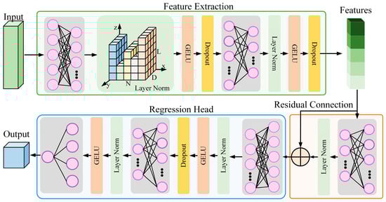 The input data is processed through a feature extraction module (green), followed by a regression head (blue) and a residual connection (orange) to enhance prediction. GELU refers to Gaussian Error Linear Unit, Layer Norm is layer normalization, and Dropout is used for regularization. Purple circles and their connecting lines denote fully connected layers, which map extracted features to the final prediction outputs.