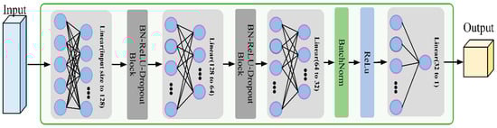 As illustrated in Figure 3, the model consists of multiple linear layers with ReLU activation functions behind each layer, while Dropout layers are used between hidden layers to reduce the risk of overfitting. The core block structure, consisting of BatchNorm, ReLU activation, and Dropout, is shown in Figure 4. This model can effectively capture the nonlinear relationship between the input data and target variables through this structural design.