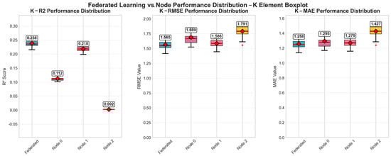 The federated model’s potassium (K) predictions demonstrated enhanced performance relative to all single-client models, although it exhibited marginally inferior performance when compared to the non-federated method. However, the federated model achieved the lowest RMSE (1.010) of all the methods, indicating better overall error minimization. This result indicates that the optimization effectively mitigates the oscillations in the federated aggregation process, which is especially beneficial for potassium prediction, for which the variability in sample attributes affects the stability of measurements.