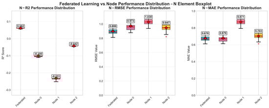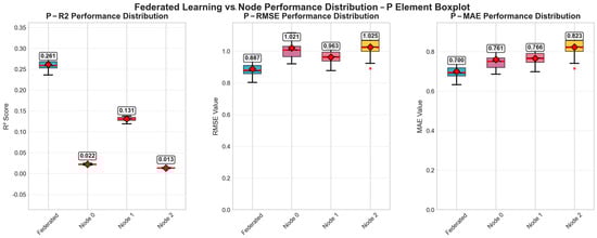 According to the results shown in Figure 8, nitrogen was the most favorable predictor among all methods, with the lowest error values and the highest coefficients of determination. This suggests that the inherent characteristics of nitrogen content may make it more suitable for spectral analysis and subsequent machine-learning-based predictions. Conversely, phosphorus prediction demonstrated the most arduous qualities, characterized by persistently elevated error metrics and consistently low R2 values in both federated and non-federated implementations. Phosphorus compounds typically display intricate spectral features that fluctuate markedly with the mineral composition and pH level of samples.