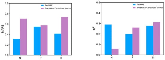 As shown in Table 4, our FedMAE model consistently outperformed both comparative models across all nutrient prediction tasks. The improvements were particularly notable in the nitrogen prediction task, in which FedMAE achieved the lowest error metrics, demonstrating its superior capability to capture complex spectral patterns in a decentralized setting.