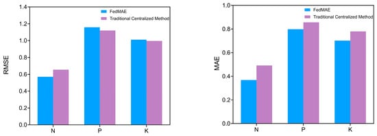 To further highlight the effectiveness of our proposed FedMAE regressor, we com-pared its performance against two widely used traditional regression models: Gradient Boosting Decision Trees (GBDT) and Extreme Gradient Boosting (XGBoost). Both models were trained in a centralized manner using the aggregated dataset. The comparison was conducted for all three target attributes—nitrogen (N), phosphorus (P), and potassium (K)—using two standard metrics: Mean Absolute Error (MAE) and Root Mean Squared Error (RMSE).