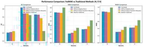 Figure 9 presents the results of the ablation study, evaluating the contributions of the two key architectural components in the FedMAE regressor mentioned above. The baseline included the full model, and comparisons were made against two ablated versions—one with adaptive normalization removed and one without the feature transform allocation block—as well as against a traditional regression model. Removing adaptive normalization resulted in performance degradation, particularly in the phosphorus (P) and potassium (K) prediction tasks. For instance, in the potassium prediction scenario, the R2 dropped from approximately 0.67 to 0.66, accompanied by a slight increase in RMSE. This indicates that adaptive normalization plays an important role in stabilizing feature distributions across clients with heterogeneous data.