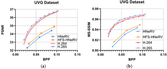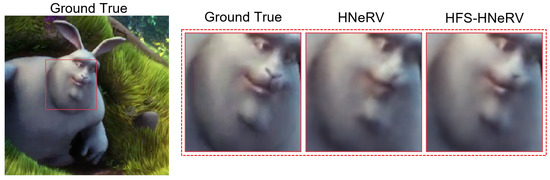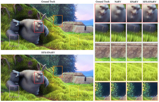 In this paper, we utilize the hybrid representation network architecture of HNeRV. Therefore, most of the experimental settings are consistent with HNeRV. For the dataset, we adopt the Big Buck Bunny (the Big Buck Bunny dataset is available at https://github.com/haochen-rye/HNeRV (accessed on 25 June 2024)), a widely used open-source animated video, which includes 132 frames with resolution of , cropped to the center with a resolution of . The selected segments depict an animal coming out of a tree hole and stretching as it stands upright, covering a range of scenes with different levels of motion (from static to moving objects) and texture complexity (such as smooth backgrounds and detailed foliage or grass). To evaluate the model’s performance on a publicly available benchmark, we applied center cropping to the UVG dataset (the UVG dataset is available at https://ultravideo.fi/dataset.html (accessed on 28 December 2024)) (7 videos in full HD resolution () with a frame rate of 120 frames per second (fps)), resulting in a resolution of . They include fast motion (such as a speedboat, bee wings, and running horse), high-frequency textures (such as long hair, petals and waves), and rich structural information, making it suitable for evaluating the generalization and robustness of video reconstruction models. For performance metrics, we retained the same settings as those in HNeRV [19], specifically the peak-signal-to-noise ratio (PSNR) and multi-scale structural similarity index measure (MS-SSIM). Moreover, we selected multiple regions within the images to conduct a human visual quality comparison. During training, we used the Adam optimizer with and a weight decay of 0. Furthermore, we set the learning rate to 0.001 with cosine learning rate decay. Unless otherwise stated, all experimental models are baselined with model size of 1.5 M, training epochs of 300, and bit per pixel (bpp) of 0.109. All experiments were conducted on one laptop-based RTX 3060 GPU. the reported performance results were also measured on this GPU to reflect parallel execution, excluding data loading and preprocessing overhead.