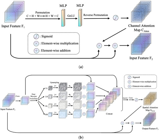 (a) Channel Attention: This part employs dual multi-layer perceptron to integrate the intra-channel contextual information of the input features, computing the output feature map through a residual structure. (b) Spatial Attention: We enhance high-frequency information by incorporating Haar wavelet transform into the spatial attention mechanism. Note that symbolizes the two-fold upsampling operation.