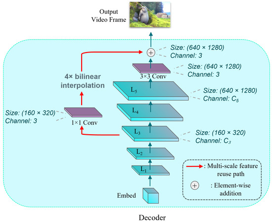 Finally, inspired by classical image and video super-resolution networks, we introduce several modifications to the decoder’s structure. Specifically, we incorporate a multi-scale feature reuse path (MSFRP), which enriches the final output feature representations by fusing feature maps from different scale layers.