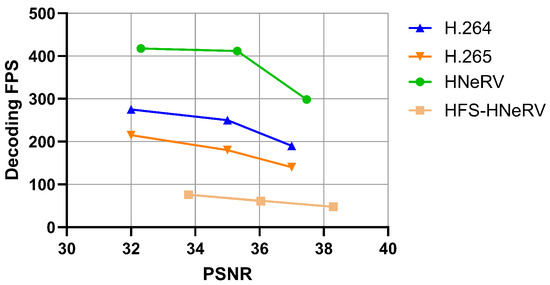 For the traditional methods, we directly cite the FPS values of H.264 and H.265 reported in previous work. Since these methods were evaluated using four CPU threads on Intel Xeon 4216 processors, the setup is closer to real-world application scenarios. For the NeRV method, due to the significant performance gap caused by the mobile version of the RTX 3060 GPU, we benchmarked HNeRV and HFS-HNeRV by using the RTX A6000 GPU, whose performance is more comparable to that of a four-core Xeon CPU.