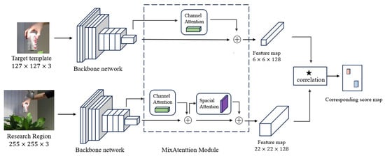 The overall framework of the target-tracking algorithm based on the dual attention mechanism is shown in Figure 1. The input of the network includes a target patch and a search patch, and the output is a two-dimensional score map, which represents the similarity distribution of the template image at each position in the search image. The network consists of two sub-networks with a similar structure and shared weights. After receiving two relevant samples, the improved AlexNetv2 backbone network extracts multi-level features of the image, where shallow features contain detailed information such as edges, colors, and textures, and deep features contain high-level semantic information such as target categories [28]. Sub-networks integrate the channel attention mechanism and the spatial attention mechanism, generate channel weights through global average pooling and maximum pooling, and generate spatial weights through the pooling and convolution of the spatial dimension. Finally, the multi-level feature maps of the two sub-networks are used to calculate the cross-correlation response map between the template and the search area.