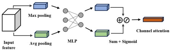The channel attention structure is shown in Figure 2, where F is the input feature map, and are the results after average pooling and maximum pooling, W is a two-layer fully connected layer network, and is a sigmoid function used to normalize the weight. The channel attention first performs global average pooling and global maximum pooling on the input feature map, and then it sends the two pooling results to a shared multi-layer perceptron (MLP) for learning. The MLP outputs are merged through an element-wise sum and then processed via a sigmoid activation function to finally generate a channel attention weight matrix.
