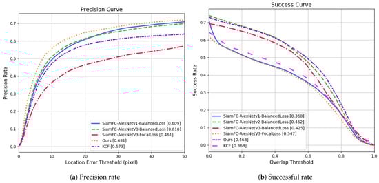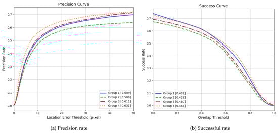 In order to investigate the effects of the attention mechanism and IoU loss function, we organized some ablation experiments. Group 1 serves as the baseline, employing AlexNetV2 as the backbone network and balanced loss as the loss function. Groups 2 and 3 introduce two additional components: an attention mechanism and IoU Loss, respectively. Table 2 shows the results of the ablation experiment. When only the attention mechanism is added (Group 2), both accuracy and the success rate decrease compared to the baseline. This may be because SiamFC performs local template matching through a cross-correlation operation, which inherently emphasizes precise spatial alignment. But the spatial attention module blurs position-sensitive features, and especially large convolution kernels may destroy the target boundary information, resulting in a decrease in accuracy and the success rate. When only the IoU loss is added (Group 3), the accuracy increases slightly, but the success rate hardly changes. This may be because the success rate measures the comprehensive performance of the IoU between the predicted box and the true box under all thresholds. Since the backbone has not changed, the overall performance and success rate of the algorithm have not changed. The IoU loss reduces the drift of the center point by optimizing the bounding box coordinates, which increases the accuracy of Group 3 by 0.3%. Group 4 adds both the attention mechanism and the IoU loss, which is our proposed method. The attention mechanism directs focus to salient regions, while the IoU loss promotes global geometric alignment and corrects the attention weight distribution. This compensates for the positional insensitivity of the attention mechanism, resulting in a better balance between the accuracy and the success rate. As shown in Figure 4, Group 4 achieves the highest performance in both metrics, highlighting the importance of integrating both components.