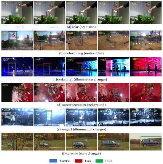 OTB2015 contains a variety of challenging tracking scenarios, including illumination changes, occlusion, fast movement, complex background, scale changes, motion blur, etc. Based on the above challenges, this paper selects six representative video sequences and scenarios to demonstrate the tracking effect of our proposed algorithm, as shown in Figure 6. In the coke sequence, KCF (the green box) loses the target after the object is occluded. In motorrolling, our algorithm (red box) is more adaptable to the challenges of object shape changes and rotation than others. In the skating1 sequence, our algorithm achieves more outstanding bounding box localization accuracy at the 387th frame. In the soccer sequence, our algorithm can effectively cope with the challenges of a complex background. In the singer1 sequence, illumination changes impact the localization accuracy of the bounding box. KCF fails to adapt to these variations, leading to tracking drift at the 242th frame. In contrast, our algorithm maintains stable tracking. In the carscale sequence, SiamFC (the blue box) struggles to adapt to scale variations of the target, whereas our algorithm successfully handles the change and maintains accurate tracking.
