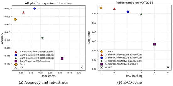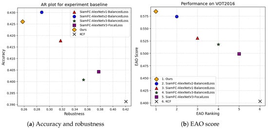 We further conducted comprehensive experiments on the VOT2016 dataset [37], which consists of 60 challenging video sequences and also employs accuracy, robustness, and EAO as evaluation metrics. The results presented in Table 5 and Figure 8. Among all tested algorithms, the SiamFC-AlexNetv2-BlancedLoss achieves the highest accuracy, reflecting its strong localization capability. However, our proposed method demonstrates the best robustness score of 0.258. This is because the attention mechanism can establish long-range dependencies between features, helping the model understand positional variation patterns of the target across frames and thereby enabling a more robust tracking of moving objects. In addition, our method achieves the highest EAO score of 0.585, effectively balancing tracking accuracy and robustness and making it a strong comprehensive indicator of real-world performance. In terms of tracking speed, our method runs at 48.8 FPS, ranking second among the compared trackers. This speed is well above the real-time threshold (typically 25–30 FPS), ensuring its practical applicability in real-time tracking scenarios such as video surveillance, autonomous driving, or human–robot interaction. The above experiments clearly demonstrate that our proposed tracker achieves a strong trade-off between accuracy, robustness, and speed, outperforming several state-of-the-art methods and showing strong competitive performance on the VOT2016 benchmark.