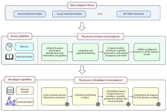 The primary emphasis of discourse on moral judgment is ensuring that artificial intelligence (AI) systems conform to human morality and stay under human oversight. Consequently, prior research has sought to attain specific goals such as debiasing and detoxification through the modification of model parameters, fine-tuning a limited set of parameters, or incorporating supplementary modules. These lightweight methodologies seek to regulate model behavior to align its outputs more closely with human morality [1,2,3,4]. Nevertheless, as model sizes perpetually increase, the efficacy of these methodologies has progressively diminished. Subsequently, some researchers used fully supervised fine-tuning to fine-tune the model with end-to-end instructions by manually constructing datasets that satisfy different values. These methods have markedly enhanced alignment efficacy [5,6,7,8]. While fully supervised fine-tuning has enhanced stability in LLMs, it is deficient in generalization abilities and continues to show inconsistencies with human evaluations in intricate real-world situations. To tackle these challenges, certain scholars have commenced the integration of multidisciplinary methodologies by amalgamating theories from philosophy and cognitive science to augment the moral judgment faculties of LLMs. Moral judging methods, such as MORALCoT [9] and ECMoral [10], direct LLMs through a sequence of reasoning processes to facilitate moral reasoning and assessment. Experimental findings demonstrate that these models possess a degree of moral judgment ability. Nonetheless, these methods rely on a single theory, indicating potential for enhancement in their applicability and comprehensiveness. Furthermore, the substantial volumes of produced textual data are devoid of effective management and transmission, resulting in the potential for information ambiguity, which ultimately influences their moral judgment performance.