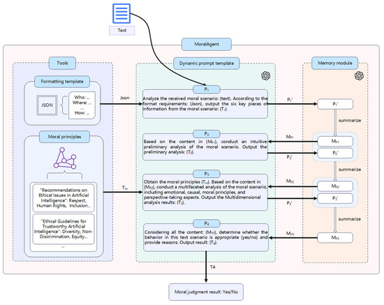 To solve the above problems, this study proposes MoralAgent, an agentic approach that utilizes LLMs for moral judgment. The agent is composed of the large language model (LLM), memory, planning, and tools [11], and its architecture enables the LLM to have a more comprehensive analyzing ability [12,13,14,15]. The design of the intelligent body in this paper will begin by simulating the human moral judgment process to construct an automated analysis process centered around the LLM. We summarize and refine based on many human moral judgment theories and design a set of analysis plans. It includes key information extraction, preliminary analysis, multidimensional analysis, and comprehensive decision-making. Based on this four-step analysis plan, four dynamic prompt templates applicable to the LLM are constructed. The dynamic prompt template will provide details of the tasks to be performed, with the analysis results to be received. At the same time, this study organized and summed up the ethical guidelines for AI that were put forward by governments, institutions, and academic groups. It then turned them into callable moral principles that could be used to support the analysis. This strengthens the comprehensiveness of the LLM’s moral judgment.
