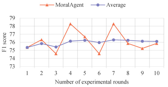 To ensure more reliable experimental results, this study further increased the number of experiments in comparative analysis compared to methods in previous research. A total of 10 rounds of experiments were conducted. As shown in Figure 3, the results demonstrate that the judgment results generated by this method exhibit high stability. Specifically, the variance of the F1 score is 1.60, and no extreme values caused by the uncertainty of LLM outputs were observed. From the second round onward, the average F1 score in each round fluctuated slightly around 76. Therefore, based on a comprehensive consideration of the experimental results and resources, the final report adopts the average results of the 10 rounds of experiments as the final evaluation metric.