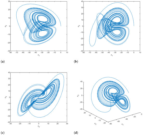 where , , are the state variables, and the system is chaotic when its parameters have the following values: , , , . The numerical simulations of the system of Equation (1) are illustrated by the attractors in Figure 1.