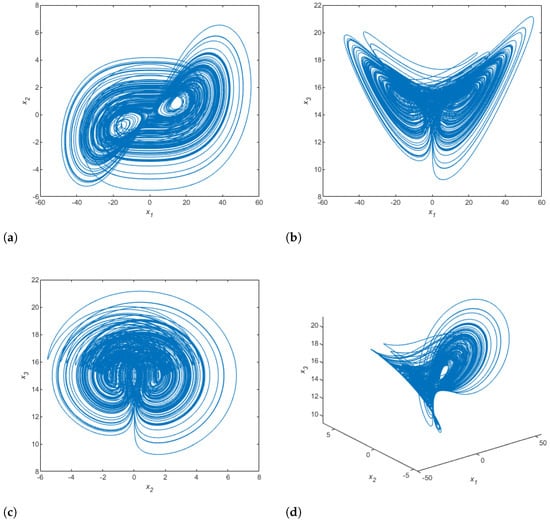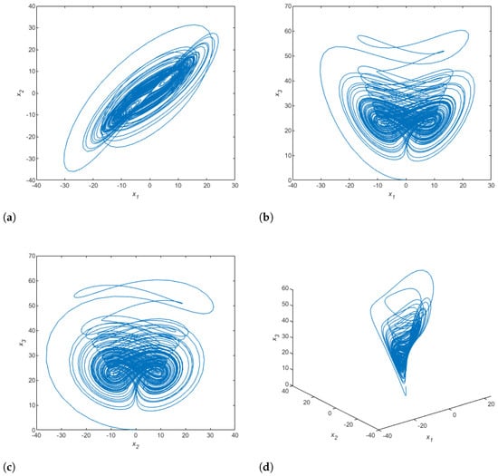 Numerical simulation of Chen’s chaotic system attractors: (a) plane; (b) plane; (c) plane; (d) 3D plot.