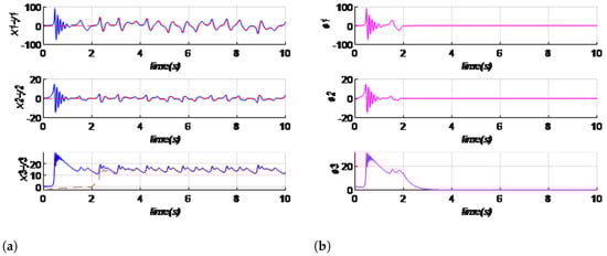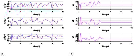 Synchronization of 3D chaotic system master–slave activated at : (a) time series , , ; (b) errors synchronization and the control law are = (2, 2, 2).