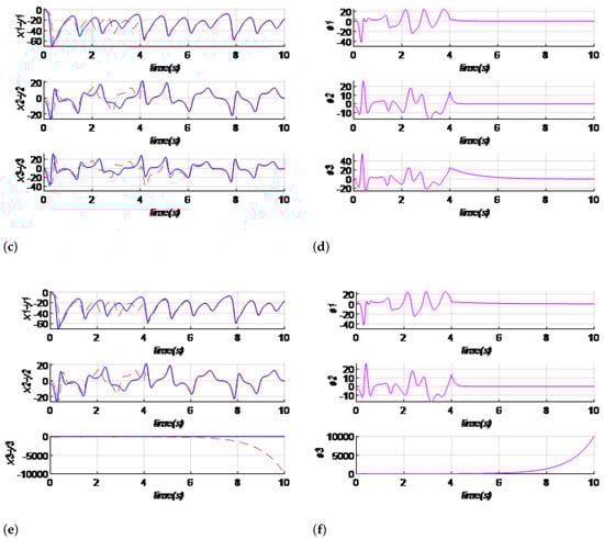 We observe from Figure 4 that each of the signals coming from the master and slave system start from different initial conditions and the control law is activated at ; the signal become synchronized at this point for different values of the control gain that satisfy Equation (21). In Figure 4a–d, the control gain values are = (5,5,5) and = (0,0,0), which satisfy Equation (21), and the synchronization is achieved. In Figure 4e,f, the control gain values are = (−2, −2, −2) for ; Equation (21) is not satisfied and synchronization is not achieved.
