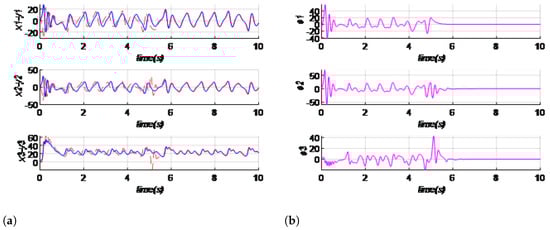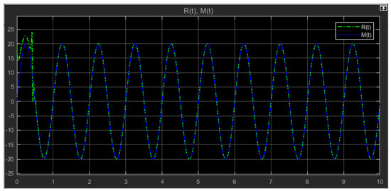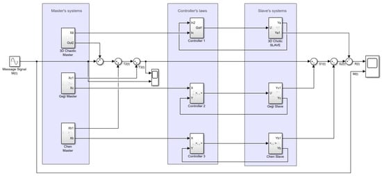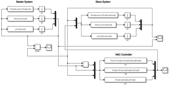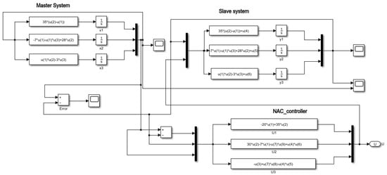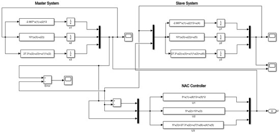 In Figure 5, we present the Simulink block diagram that describes the master–slave chaotic system and the NAC law. The simulation result is presented in Figure 6.