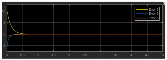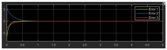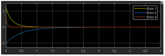 In Figure 11, we present the Simulink diagram of the master–slave 3D chaotic system and NAC law to achieve synchronization. The simulation result of the errors synchronization is presented in Figure 12; the errors converge to zeros at .
