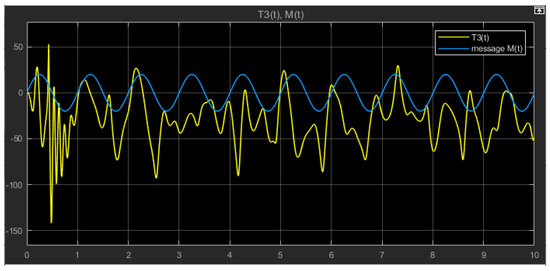 Figure 14 illustrates the difference between the initial message and the secure information signal after the third masking step. As shown in Equation (31), three chaotic signals are represented by dynamic variables originating from the three different chaotic systems to mask the message from the transmitter side. This increases the complexity of the communication system and makes the message very difficult to be identified by an intruder. Our information signal underwent three successive masking steps. The signal containing the information obtained after these three steps became more secure.