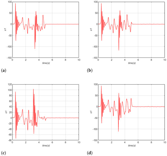 where X is the state variable and P is the system parameter. To evaluate this, we consider , where is uncertainty. In Figure 16, we consider the 3D chaotic system and apply the uncertainties of , 0.2, 0.3, and 0.4 to all parameters of the slave system. For different values of uncertainty , the synchronization is maintained.