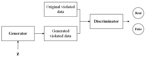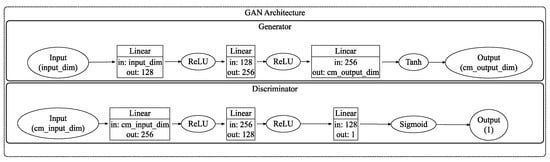 Generative Adversarial Networks (GANs) [] are deep learning architectures based on adversarial training with two core components, namely, a generator (G) and a discriminator (D), as illustrated in Figure 3. The generator produces synthetic data from a latent variable z, while the discriminator assesses the probability that a given input originates from the true data distribution rather than from G. These two networks are jointly optimized through a min–max game: the generator aims to minimize the distinguishability between its outputs and real data, whereas the discriminator strives to maximize its accuracy in differentiating the two. During training, a significant drop in the generator’s loss indicates that the synthetic data is converging towards the real distribution, while an increase in the discriminator’s loss reflects greater confusion between the generated and real data in the feature space. Ultimately, this adversarial mechanism drives the generated data to statistically align with the true distribution. Figure 4 is a detailed architecture diagram of the generator and discriminator of GAN, showing the size of each layer and clearly illustrating the process of the coverage matrix changing from input to output.
