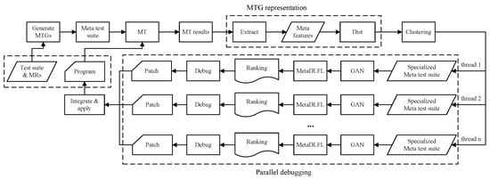 Therefore, we propose MetaGAN: Metamorphic GAN-based Augmentation for Improving Multiple Deep Learning-based Fault Localization Without Test Oracles. The core idea behind MetaGAN is to leverage a powerful and widely adopted GAN model [] to generate additional failed samples, thereby constructing a balanced dataset that enhances the efficiency of MetaMDFL fault localization. This novel method integrates metamorphic testing, clustering algorithms, and GAN to extend multiple-fault localization to scenarios where test oracles are unavailable. Specifically, failed Metamorphic Test Groups (MTGs) are first obtained via metamorphic testing, from which metamorphic features that capture the underlying fault causes are extracted. These features are then used to cluster the MTGs into several groups, with each cluster representing an independent single-fault debugging activity. Finally, within each debugging activity, data augmentation is performed by combining Metamorphic Testing (MT) with the GAN model to generate additional failed test cases (i.e., the minority class) until their number matches that of the non-failed test cases (i.e., the majority class). This balanced dataset enables accurate fault localization and facilitates the parallel debugging of multiple faults.