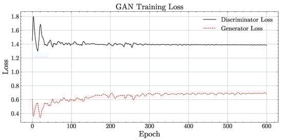 (5) Violation of Dataset Augmentation Using the GAN Model: Subsequently, for each cluster , an adversarial network is integrated within the GAN model to augment the failed metamorphic test data. Specifically, the generator G produces synthetic data for failed MTGs by sampling from a latent variable z, while the discriminator D evaluates the probability that the input data originates from the true distribution of failed data rather than from the generated output. Figure 6 shows the loss curves of the generator and discriminator during GAN training on some datasets. This curve is used as a criterion for stopping training when it is relatively stable and smooth, that is, reaching the Nash equilibrium state. A low loss for the generator indicates that the synthesized fault data is nearly identical to the real fault data. The original failed MTGs, the generated failed MTGs, and all passed MTGs are then merged to form an independent metamorphic test suite . Finally, these independent metamorphic test suites are distributed to developers to initiate parallel debugging.