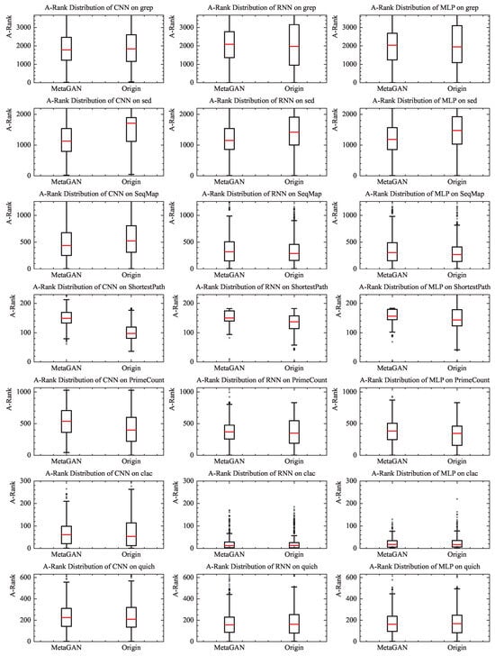 Figure 8, titled “RANK Distribution,” illustrates the performance of MetaGAN relative to MetaMDFL across different fault programs using various DLFL methods. The A-Rank distribution for all subject programs and scenarios is presented in the form of box plots. The numbers on the vertical axis in Figure 8, ranging from 0 to 200, 300, 600, 1000, 2000, and 3000, indicate the purpose of identifying faults. The average number of lines of code that need to be checked for a statement is 200, 300, 600, etc., which is sometimes referred to as the average localization cost in academia. In each box plot, the red horizontal line at the center of the rectangle represents the average rank, while the upper and lower boundaries of the rectangle correspond to the upper and lower quartiles, respectively. The short horizontal lines extending beyond the rectangle denote the maximum and minimum values after excluding outliers (which are indicated by dots in the figure). It is evident that the three DLFL methods integrated with MetaGAN outperform MetaMDFL on the grep, sed, seqMap, clac, and quich programs.