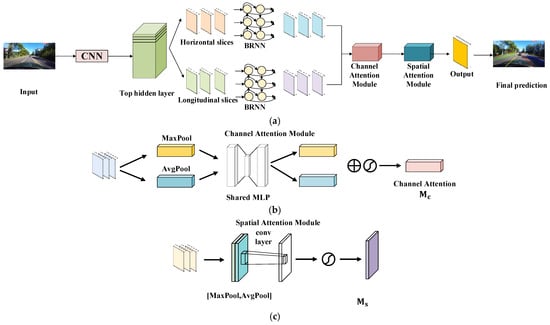 Overall framework of the BSCNNLaneNet: (a) network schematic of the BSCNNLaneNet, (b) channel attention module and (c) spatial attention module.