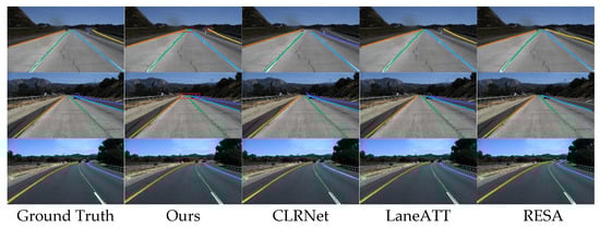 The TuSimple dataset [35] is commonly used in the field of lane detection. It is a challenging dataset that comprises 3626 images in the training set and 2782 images in the test set, each with a consistent image resolution of 1280 × 720. Lane lines are represented by equally spaced points, and their two-dimensional coordinates are stored in a corresponding JSON file. The JSON file for each image includes information on all four lane lines.