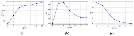Change trends of the evaluation index: (a) the change trend of accuracy, (b) the change trend of FP, and (c) the change trend of FN.