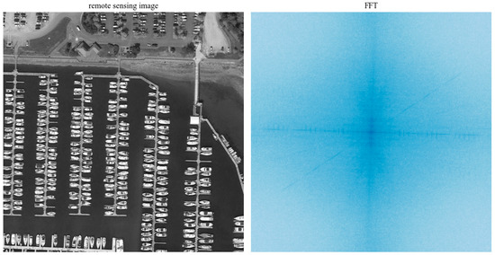 Through an analysis of the typical features of remote sensing imagery, we noticed that due to their high resolution and large size, small targets in the image were often arranged in dense spatial patterns and were typically accompanied by a significant amount of complex background noise [25]. This characteristic makes the model prone to missing detections. Figure 2 shows grayscale images from the COCO128 dataset (left) and the DOTAv1 dataset (right), along with their corresponding frequency spectrum images after fast Fourier transform (FFT). It should be noted that the spectrograms in the figure are all grayscale graph visualization results—their grayscale intensity indicates the magnitude size of different frequency components, and the color does not represent the actual color information of the original graph. As observed, the frequency spectrum of the remote sensing images exhibited a distinct “cross-shaped” highlighted region that extends outward, indicating a significant presence of periodic high-frequency components in the image. In contrast, the frequency spectrum of the ordinary image on the left has its highlights concentrated at the center, signifying that the image predominantly contained low-frequency components. This comparative experiment demonstrated that extracting more high-frequency information from remote sensing images can significantly enhance the model’s detection performance in object detection tasks, while the effective utilization of such high-frequency features can substantially improve the network’s robustness in complex scenarios [26].