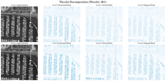 Figure 3 shows the sub-band images obtained after performing two-level discrete Haar wavelet transform on the remote sensing image from Figure 2. It should be noted, in particular, that the colors in the plots are used for visualization purposes only. The proximity maps are still in grayscale and represent the low-frequency backbone information, while the detailed component maps are rendered in blue pseudo-colors, which are used to show the high-frequency texture details in different directions more clearly, and are not the original color information of the image.