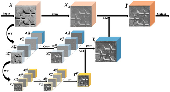 Afterward, is added to the four sub-bands , , , and from the first wavelet transform, which have also passed through the convolution layer. The result is then subjected to an inverse wavelet transform (IWT) to obtain :